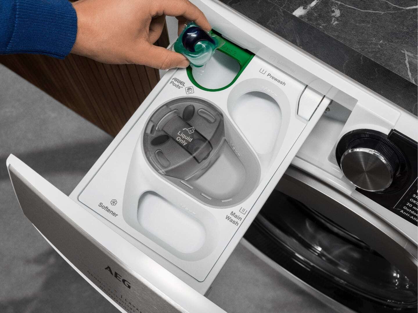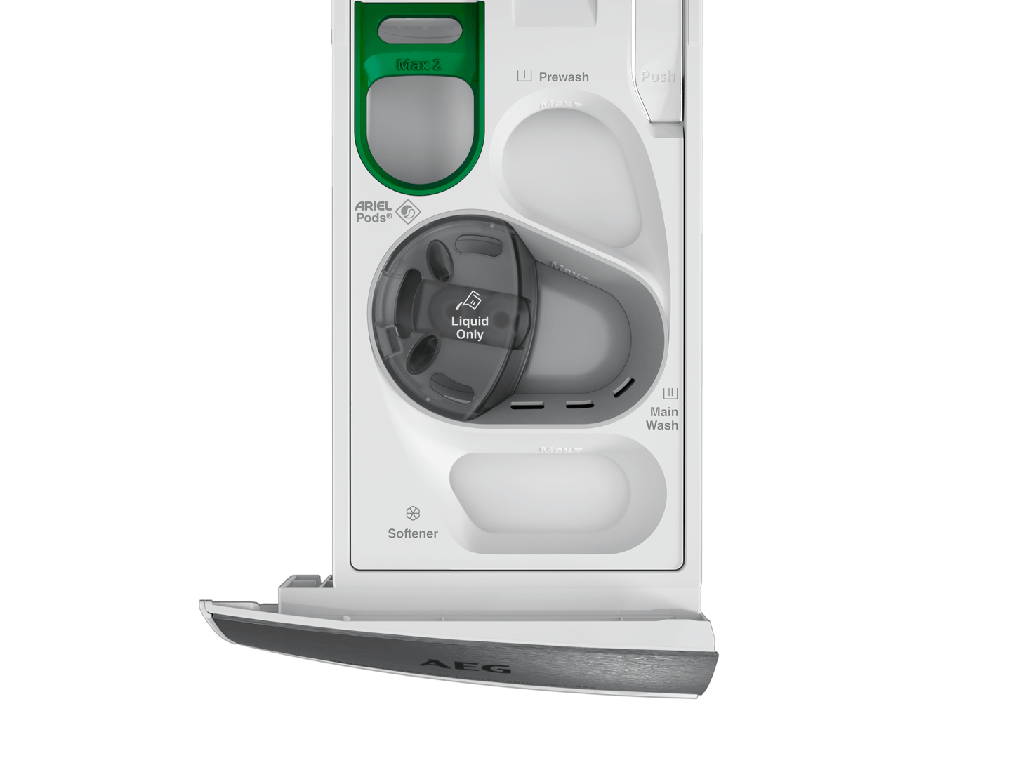 „AEG“ naujausios skalbimo mašinos, pasižymi inovatyviu „UniversalDose“ stalčiuku, patentuoto diziano ir leidžiančio naudoti visų tipų ploviklius, tame tarpe ir „Pods®“ tipo kapsules, efektyviam ištirpinimui vandenyje. Ploviklių valymo galia užtikrinama, net esant trumpoms plovimo programoms žemoje temperatūroje.