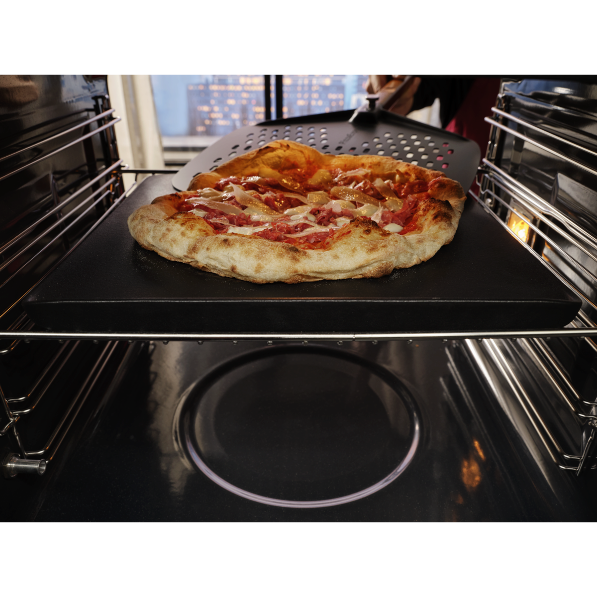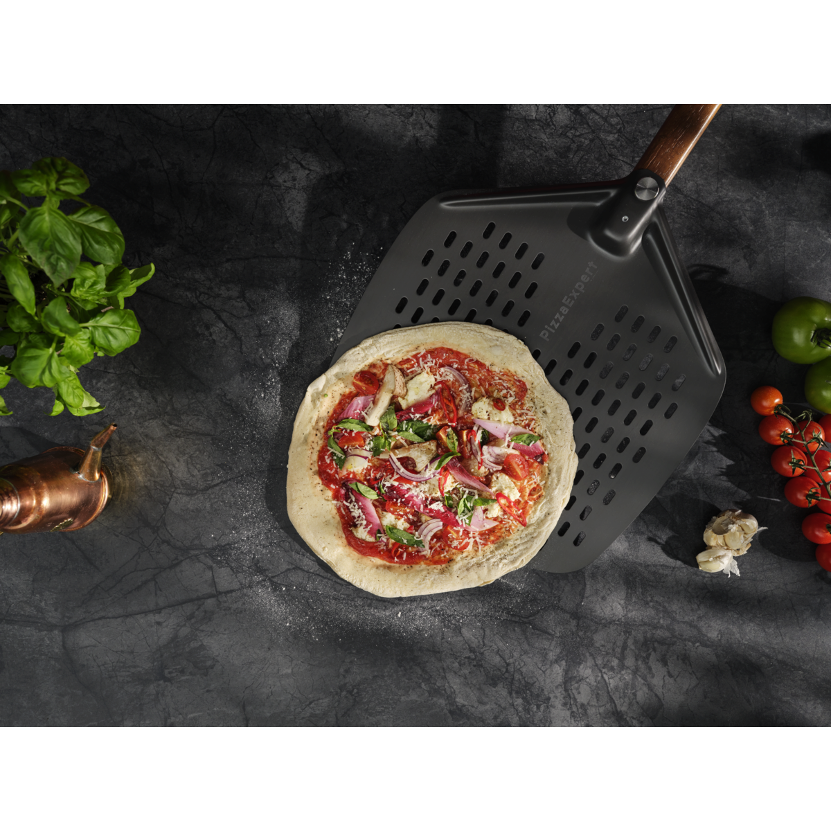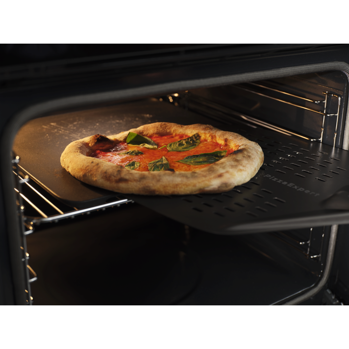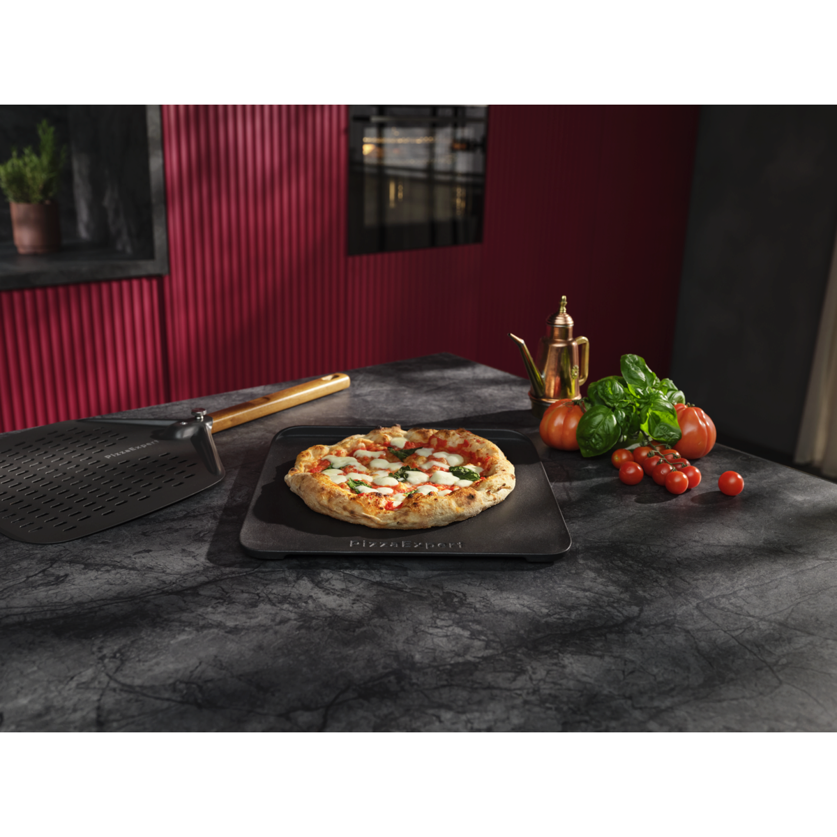 Rinkinys „PizzaExpert“: du priedai, užtikrinantys nuoseklius rezultatus. Ketaus padėklas, specialiai sukurtas atlaikyti 340 °C temperatūrą. O perforuota picos ližė suprojektuota taip, kad pica kuo mažiau priliptų ir ją būtų lengva perkelti.