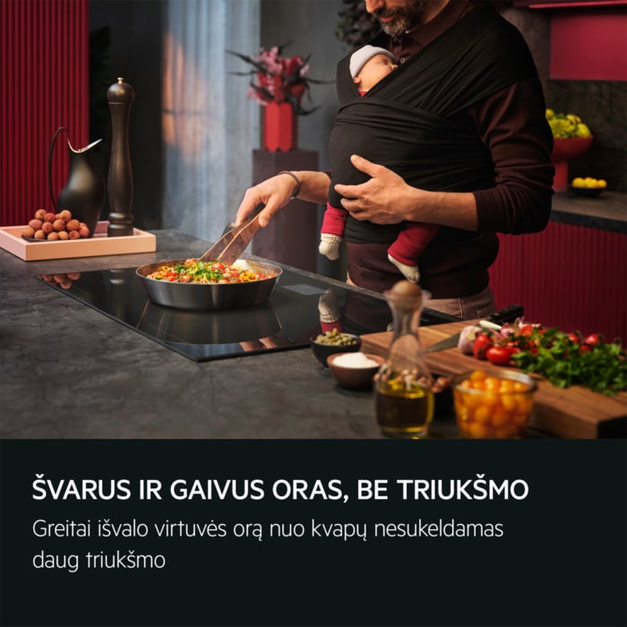 Kai įjungsite kaitlentę, „Hob2Hood®“ belaidžiu ryšiu įjungs gartraukio apšvietimą. Pradėjus gaminti maistą, ventiliatoriaus greitis bus pritaikytas pagal kaitlentės kaitros nustatymą. Ruoškite gardžius patiekalus ir nesirūpinkite dėl kvapų ar garų.