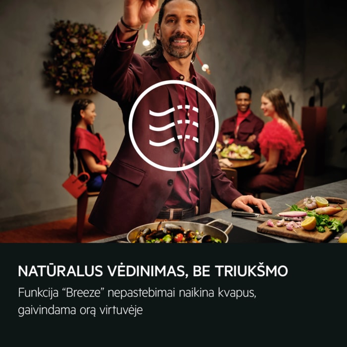 Paruošus maistą funkcija „Breeze“ tyliai atgaivins virtuvės orą ir pašalins joje tvyrančius maisto kvapus. Valgykite, atsipalaiduokite ir pramogaukite malonioje virtuvės aplinkoje, lengvai ir tyliai.