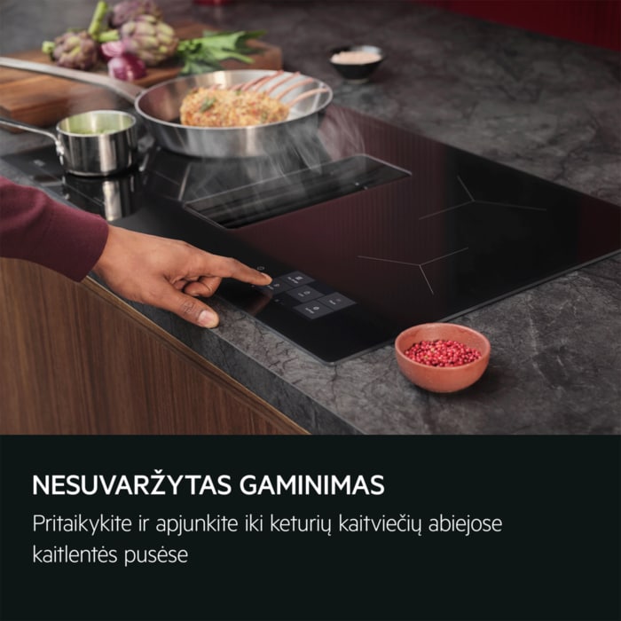 „AEG EcoLine“ indukcinės kaitlentės su integruotu gartraukiu parinktos pagal aukščiausią energijos efektyvumo klasę.
