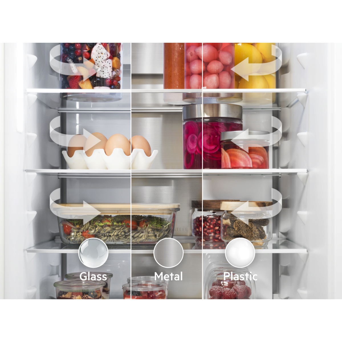 7000 serijos šaldytuvas-šaldiklis „No Frost AI CoolAssist“ prisitaiko prie Jūsų gyvenimo būdo ir reguliuoja vėsinimą, kad maistas išliktų šviežias – nesvarbu, ar ką tik papildėte produktų atsargas, ar išvykote atostogauti. „No Frost“ apsaugo šaldiklį nuo ledo kaupimosi, tad jo nereikia atitirpinti.
