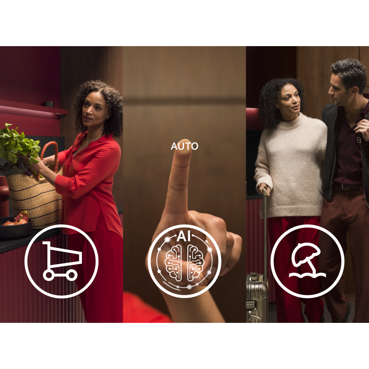 *Išbandyta su 1780 CB „MultiChill“ ir „TwinTech NoFrost“, lyginant įjungto „AI CoolAssist®“ automatinio atostogų režimo ir gamyklinių nustatymų, išjungus „AI CoolAssist®“, energijos suvartojimą, esant 25 °C. Faktinis energijos taupymas gali skirtis dėl aplinkos temperatūros ir naudojimo sąlygų.