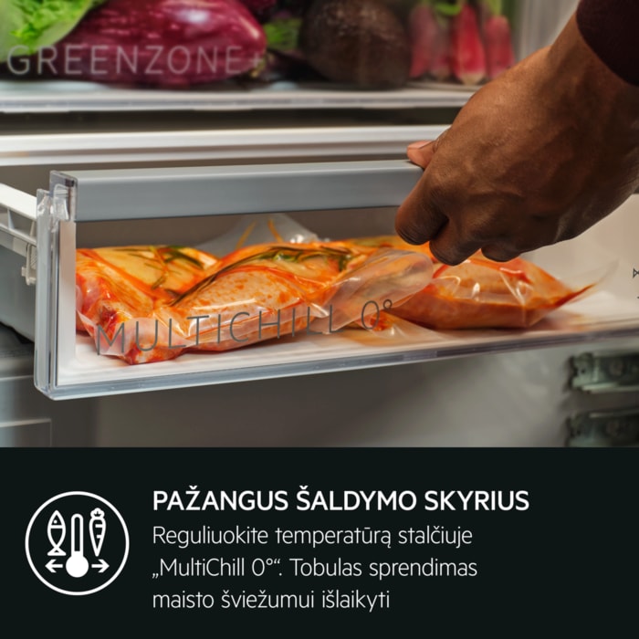„MultiChill 0°“ stalčius suteikia visišką kontrolę ir leidžia tinkamai šaldytuve laikyti mėsą ar žuvį. Pasinaudokite programėle ir atvėsinkite gėrimus, saugiai atšildykite užšaldytus produktus ar tinkamai laikykite maisto likučius.