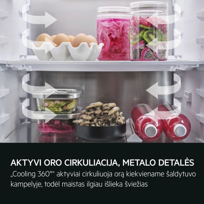 „8000 Cooling 360°“ šaldytuvas su šaldikliu turi keletą oro kanalų, kuriais užtikrinamas tolygus vėsinimas. Tai padeda apsaugoti maistą kiekvienoje lentynėlėje ir sumažinti atliekų kiekį 28 %*. Nerūdijančiojo plieno paviršiai suteiks Jūsų virtuvei elegancijos ir prabangos.