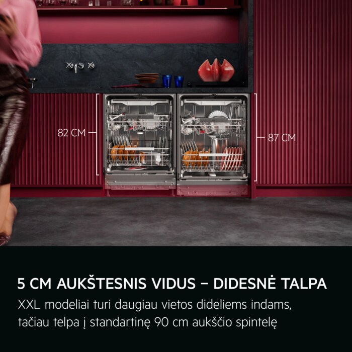 8000 serijos indaplovė „XXL“: nors vidus 5 cm aukštesnis, bet puikiai telpa į standartinę virtuvės spintelę. Galingas plovimas pašalina prikepusius maisto likučius. Universalūs krepšiai su sulankstomomis dalimis ir stiklinių laikikliais. Aukšto efektyvumo vandens sistema sunaudoja vos 8,4 l vandens.