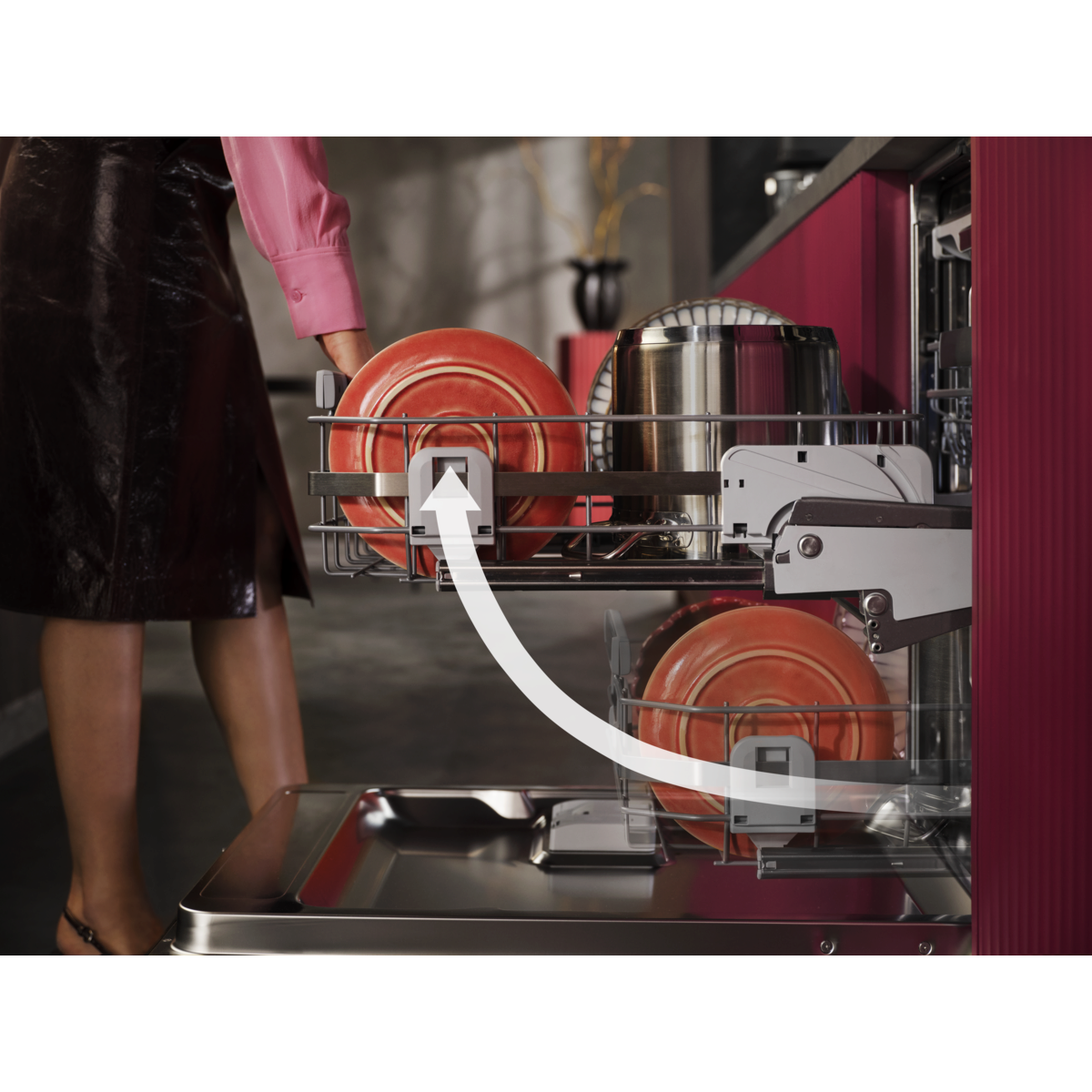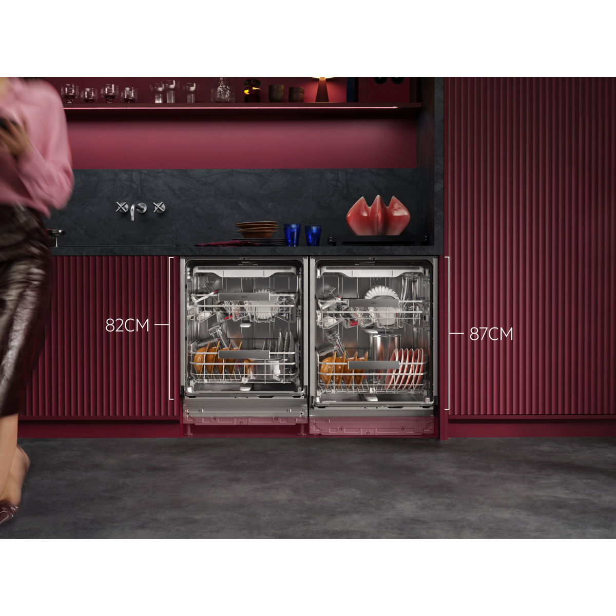 9000 serijos indaplovė „XXL“: nors vidus 5 cm aukštesnis, bet puikiai telpa į standartinę virtuvės spintelę. Daugiafunkciai krepšiai su stiklinių ir padėklų laikikliais. Galingas plovimas pašalina prikepusius maisto likučius. Aukšto efektyvumo vandens sistema sunaudoja vos 8,4 l vandens.