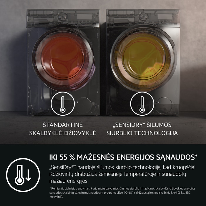 „AEG EcoLine“ skalbyklės džiovyklės parenkamos pagal mūsų aukščiausias energijos sąnaudų savybes. Garindami sutaupysite iki 96 % vandens, o dėl mūsų šilumos siurblio technologijos džiovindami net ir gležnus audinius: vilną, šilką ar pūkinius drabužius, energijos sąnaudas sumažinsite 55 %.*