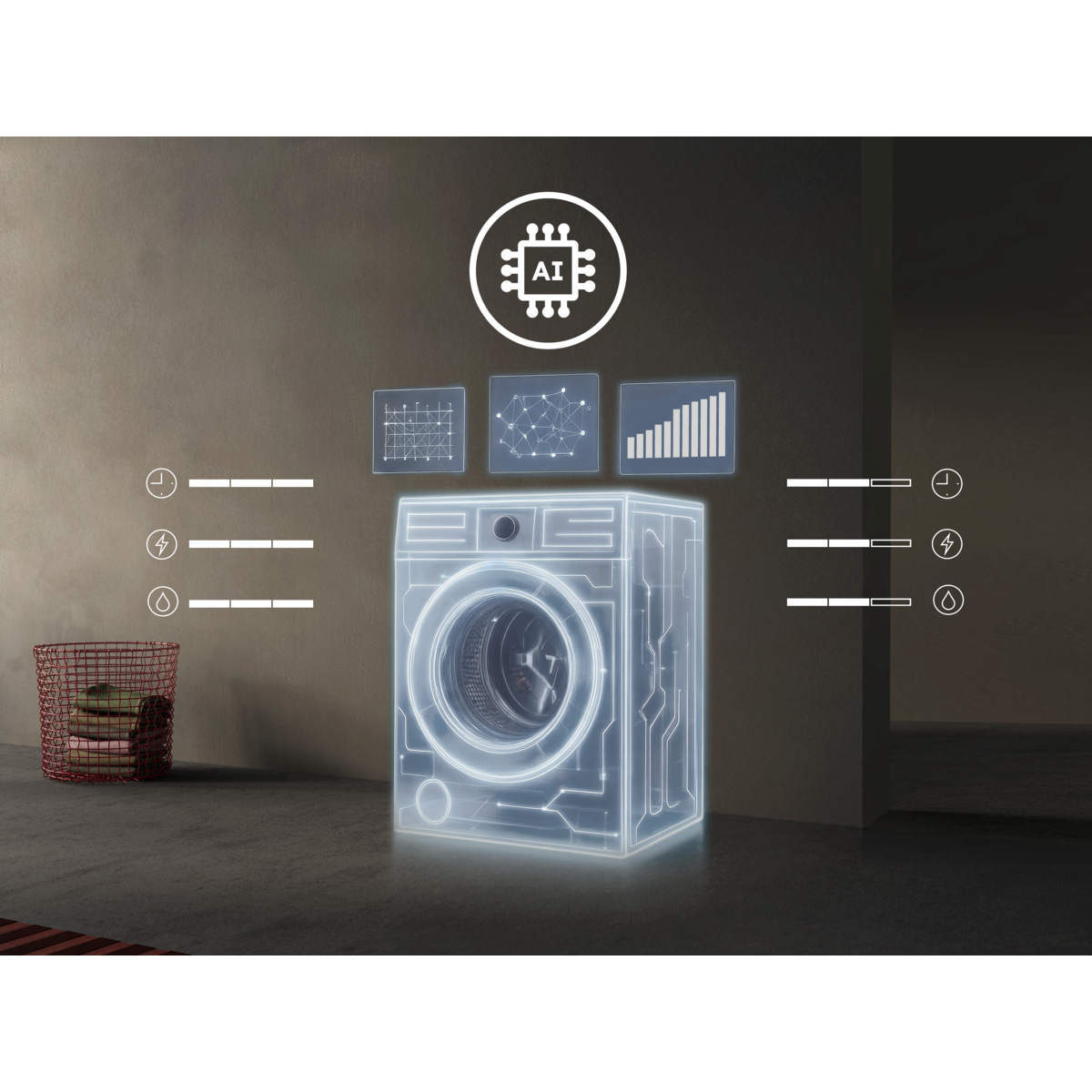 *Pagal skalbinių svorio nustatymo algoritmą, apmokytą skalbiant įvairų skalbinių kiekį. Vartotojų duomenys apmokyti DI nenaudojami. ** Vidinis laiko, vandens ir energijos sąnaudų bandymas skalbiant 1 kg (30 °C medvilnės ciklas) pasitelkus „AI WashAssist“ , palyginti su maks. skalbinių kiekiu.